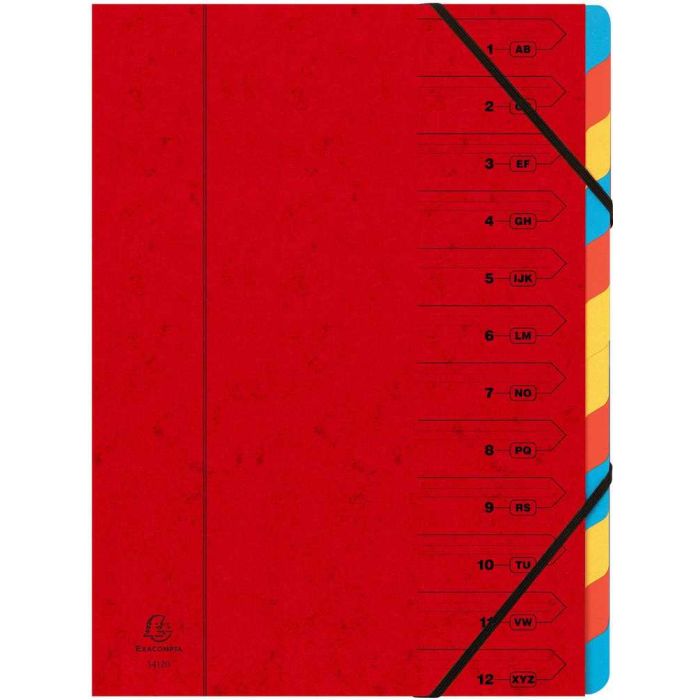 Trieur 12 compartiments avec dos agrafé et fermeture à élastiques, couverture Rouge EXACOMPTA. Produit 54125E