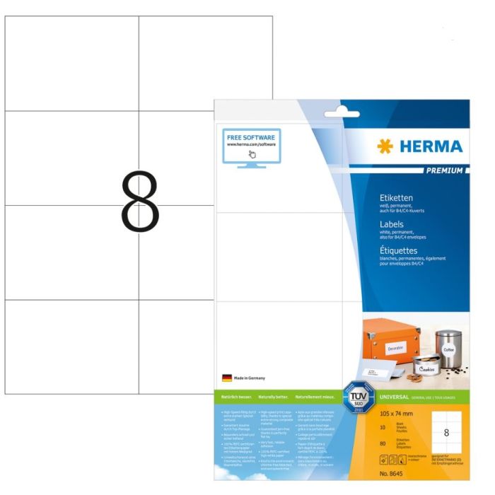 Étiquettes autocollantes à imprimer 105 x 74 mm pour un marquage de qualité Premium Herma. Produit 8645