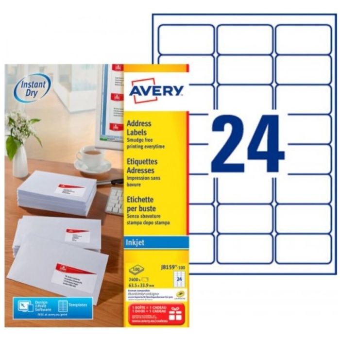 Lot de 2400 Étiquettes d'adresse autocollantes blanches 63,5 x 33,9 mm AVERY pour imprimante jet d'encre. Produit J8159-100FR