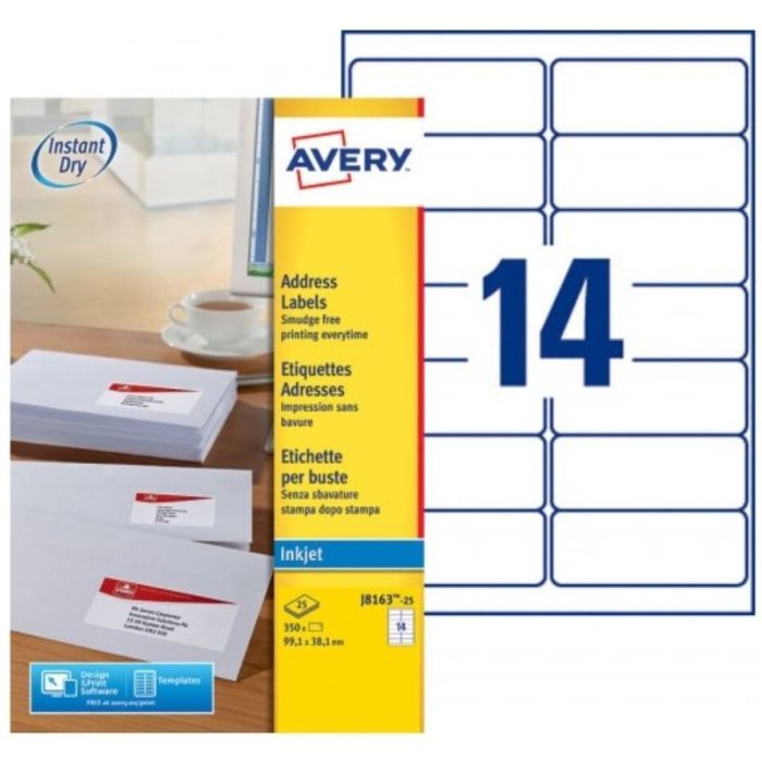 Étiquettes d'adresse autocollantes blanches 99,1 x 38,1 mm AVERY pour imprimante jet d'encre. Produit J8163-25FR